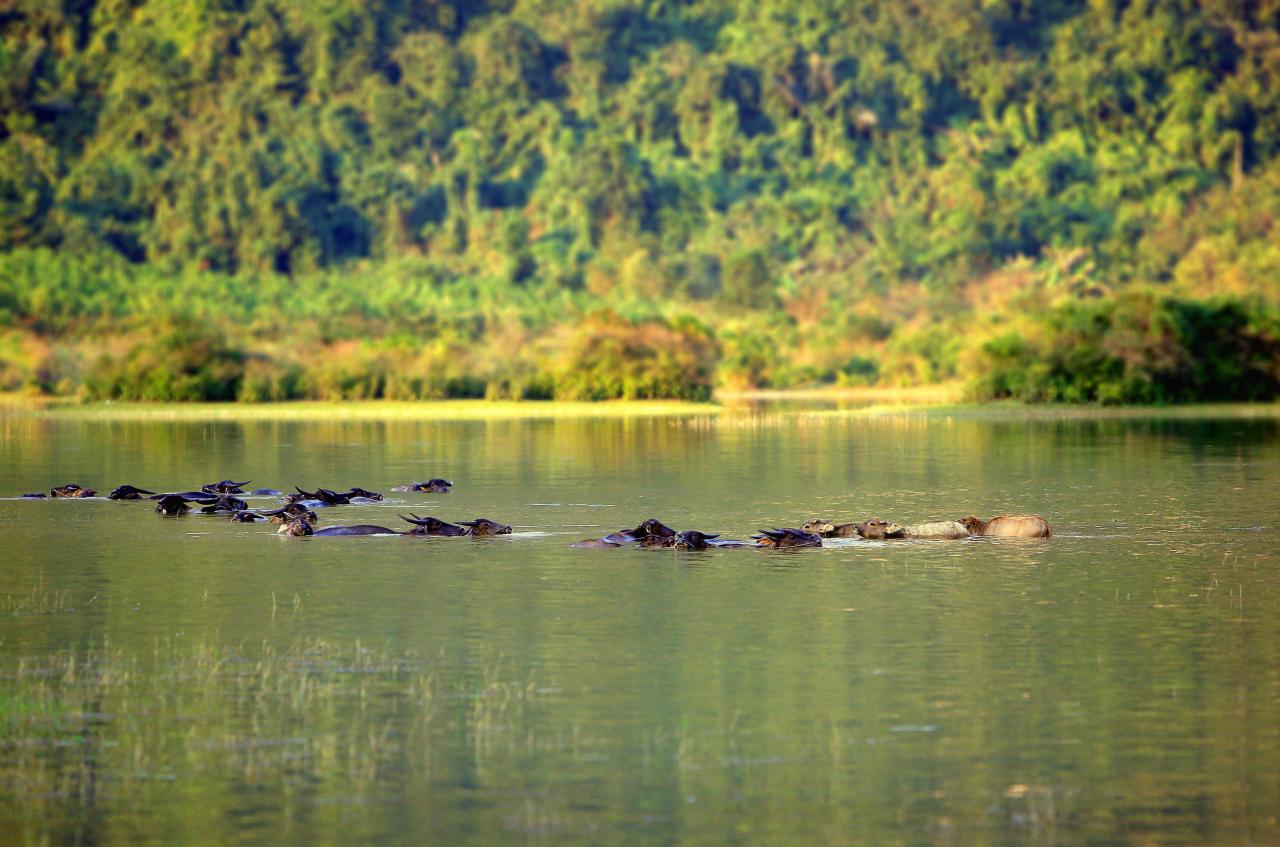 Đàn trâu của người dân địa phương trầm mình giữa lòng hồ yên ả, như một bức tranh thôn quê gần gũi đầy lý thú – ẢNH: NGỌC DƯƠNG