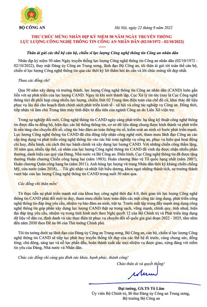 Link nguồn bài viết: https://conganquangbinh.gov.vn/bo-truong-to-lam-gui-thu-chuc-mung-luc-luong-cong-nghe-thong-tin-cong-an-nhan-dan-nhan-dip-ky-niem-50-nam-ngay-truyen-thong/