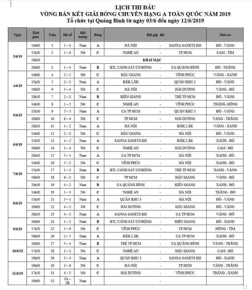 TRUYỀN THỐNG VĂN HÓA Lịch thi đấu vòng bán kết giải bóng chuyền hạng A toàn quốc năm 2019 tại Quảng Bình June 4, 2019 455 Lịch thi đấu vòng bán kết giải bóng chuyền hạng A toàn quốc năm 2019, tổ chức tại Quảng Bình từ ngày 3/6 đến ngày 12/6/2019. Xem thêm: Vòng bán kết giải hạng A toàn quốc 2017 tại Quảng Bình: Đội chủ nhà Công an Quảng Bình tranh Play Off Quảng Bình đăng cai tổ chức vòng Bán kết Giải Bóng chuyền hạng A toàn quốc năm 2017 Đồng ý chủ trương đăng cai tổ chức vòng Bán kết Giải Bóng chuyền hạng A toàn quốc năm 2019 Quảng Bình đăng cai vòng bán kết giải bóng chuyền hạng A toàn quốc năm 2019