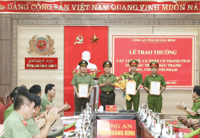Thừa ủy quyền của Bộ trưởng Bộ Công an, đồng chí Giám đốc Công an tỉnh đã trao thưởng cho các đơn vị có thành tích. Theo đó, Bộ Công an có quyết định khen thưởng đột xuất cho 4 đơn vị: phòng Cảnh sát hình sự, phòng Cảnh sát điều tra tội phạm về ma túy, Phòng An ninh mạng và Phòng chống tội phạm công nghệ cao và Công an thành phố Đồng Hới và đơn vị nghiệp vụ có liên quan thuộc Công an Quảng Bình; Phòng 7, Cục Cảnh sát hình sự mỗi đơn vị 15 triệu đồng; Công an huyện Bố Trạch, huyện Tuyên Hóa mỗi đơn vị 10 triệu đồng về thành tích đấu tranh thành công 2 chuyên án với: Chuyên án đấu tranh với các đối tượng mua bán trái phép chất ma túy, thu giữ gần 6.000 viên ma túy tổng hợp và 0,939g ketamin, 01 xe ô tô, 01 xe mô tô, 50 triệu đồng tiền mặt và nhiều tài liệu có liên quan; Chuyên án đấu tranh với các đối tượng đánh bạc dưới hình thức cá độ bóng đá qua mạng, làm rõ 34 đối tượng có liên quan với tổng số tiền giao dịch dùng cho việc đánh bạc trong hơn 1 tháng trên 80 tỷ đồng, khám xét chỗ ở của các đối tượng thu giữ hơn 110 triệu đồng, 04 xe ô tô, 21 điện thoại di động, máy tính các loại và gần 1.000 trang tài liệu thể hiện hoạt động đánh bạc qua mạng Internet.