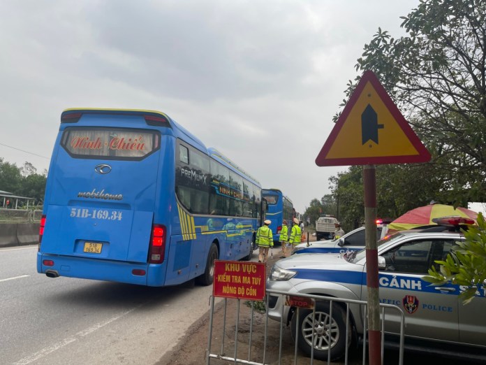 Lực lượng CSGT kiểm tra nồng độ cồn đối với lái xe ô tô vận tải hành khách.