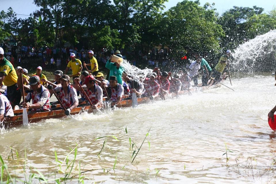 Các mẹ, các chị quần xắn qua gối, lội ra mép sông dùng nón lá, xô chậu… múc nước tạt theo thuyền để khích lệ